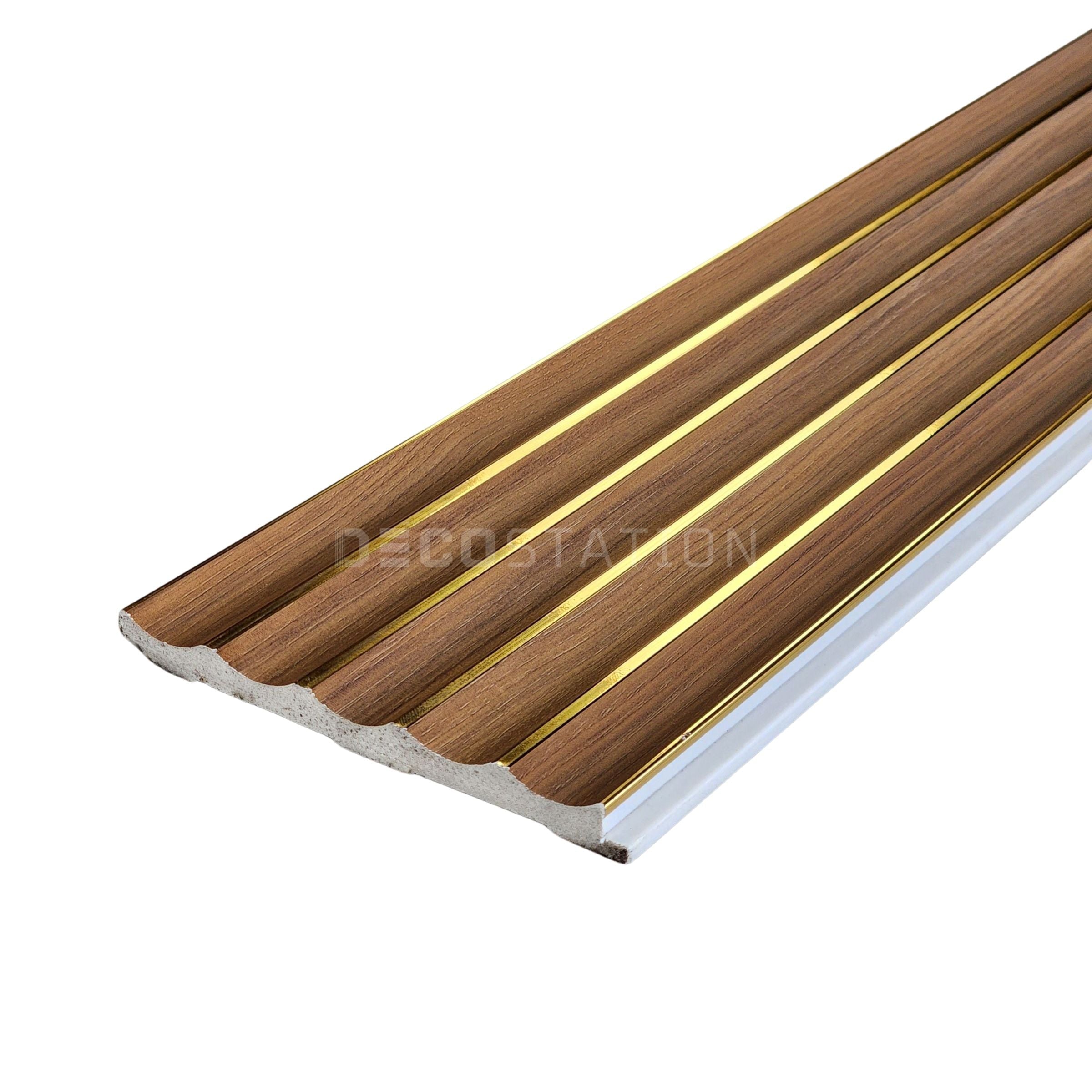 Product: WPC Decorative Fluted Panel – Natural Walnut with Gold Accents