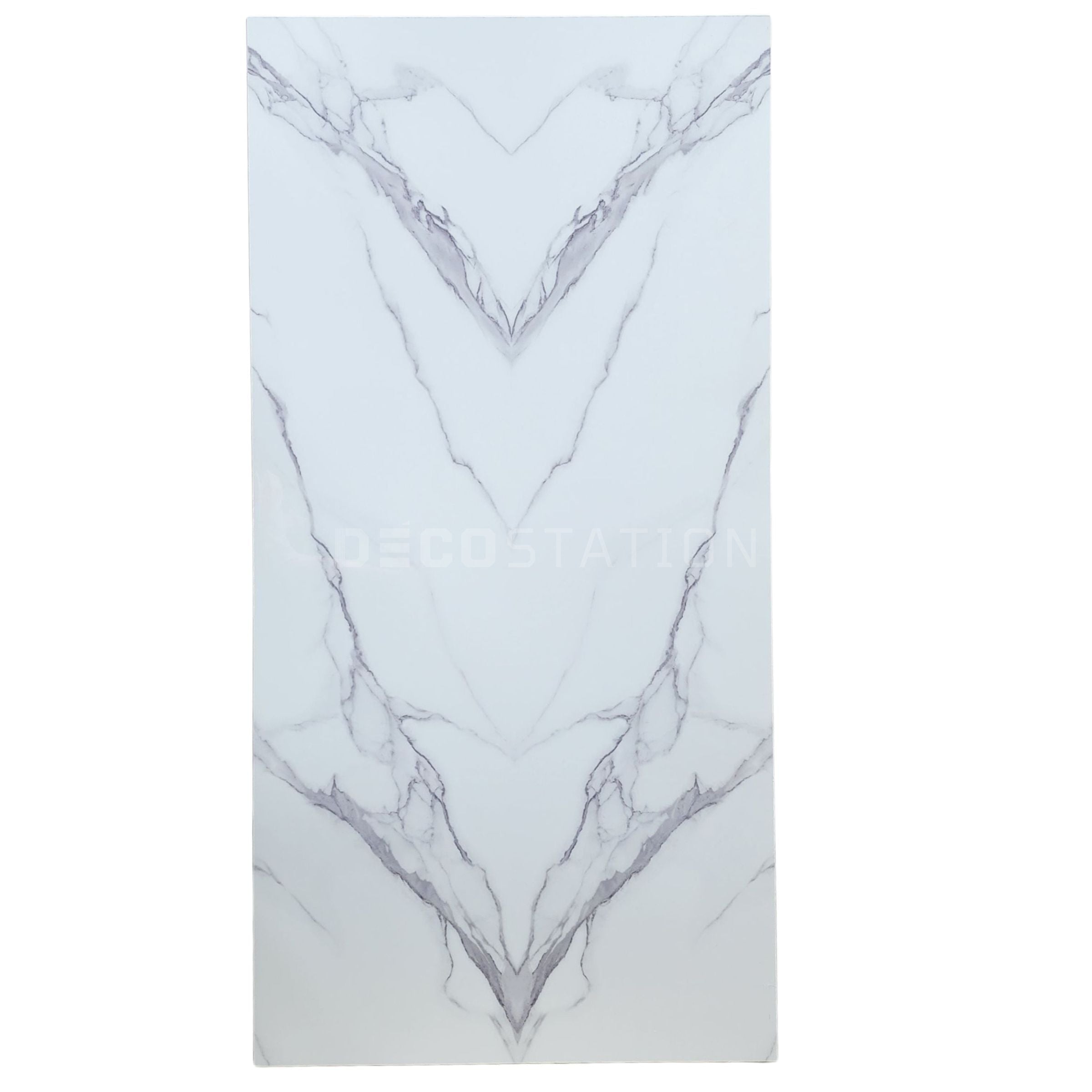 Elegant, crisp, and architectural—DecoStation’s Arctic Crown UV Marble Board transforms walls with its clean white backdrop and symmetrical vein design. The mirrored veining creates a structured and luxurious pattern, ideal for spaces that demand balance, refinement, and timeless beauty.